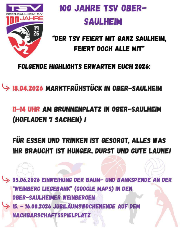 In diesem Jahr feiert einer unserer Trägervereine - der TSV Ober-Saulheim - 100jähriges Bestehen. Wir können uns auf einige Highlights freuen.